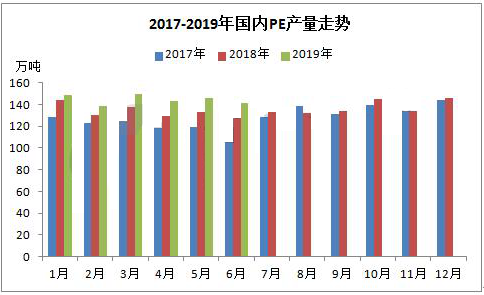 據(jù)統(tǒng)計(jì),2019年上半年國(guó)內(nèi)PE產(chǎn)量在867.21萬(wàn)噸,較2018年同期(802.68萬(wàn)噸)增加64.53萬(wàn)噸,增幅在8.04%。2019年上半年國(guó)內(nèi)PE石化大修裝置較少,開(kāi)工率較高在92%-98%之間波動(dòng)。除此之外,內(nèi)蒙古久泰能源28萬(wàn)噸/年全密度裝置在5月份順利投產(chǎn),6月份產(chǎn)量釋放產(chǎn)品逐步供應(yīng)市場(chǎng)。