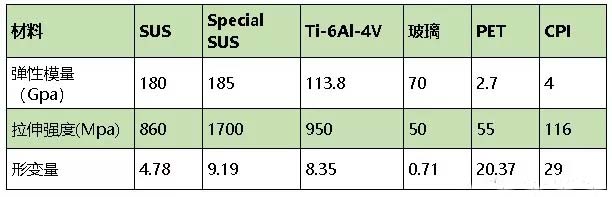 目前的屏幕基底材料以玻璃為主,但是玻璃不能彎曲折疊,因此塑料的特性成為折疊屏眼下最適宜的基底材料。熒幕基底換成薄膜后不僅基底能夠折疊,還可提高屏幕的抗摔性,同時(shí)屏幕更加輕薄。以下為列舉的幾種主要基底材料性能對比;